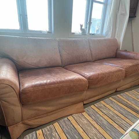 Lädersoffan fick vi i ”arv” när vi köpte huset, så vi vet inget om den. Misstänker fuskläder, men i så fall väldigt bra sådan för det är väldigt svårt att säga och den är lika skön att sitta i som soffan är stor. Tresitsig. Fasta kuddar.