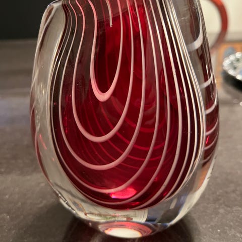 Kosta Boda vas i glas med vitmönstrad dekor. Vasen har en cylindrisk form som smalnar något nedåt och är tillverkad i klart glas med vita slingor. Passar för snittblommor eller som dekorativ inredningsdetalj. Enligt märkning är den inte avsedd för varma drycker och ska inte diskas i maskin.