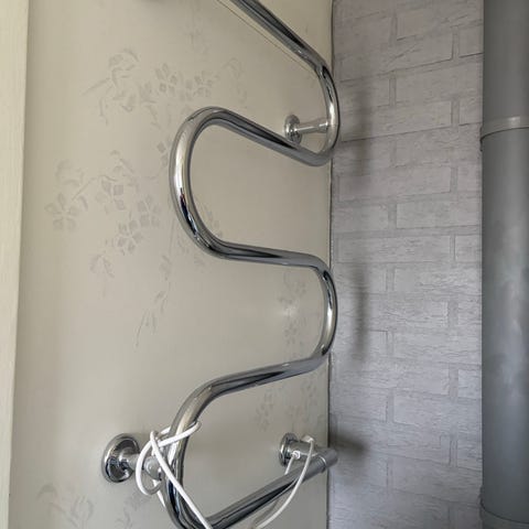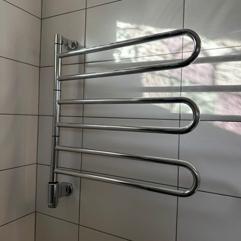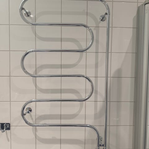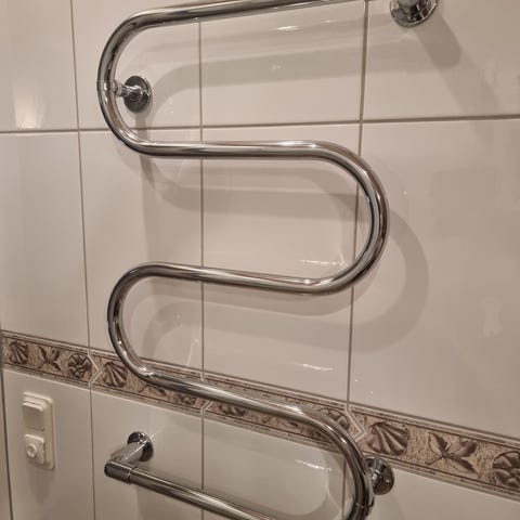 Kromad elektrisk handdukstork för väggmontering. S-formad design med tre horisontella upphängningsrör.