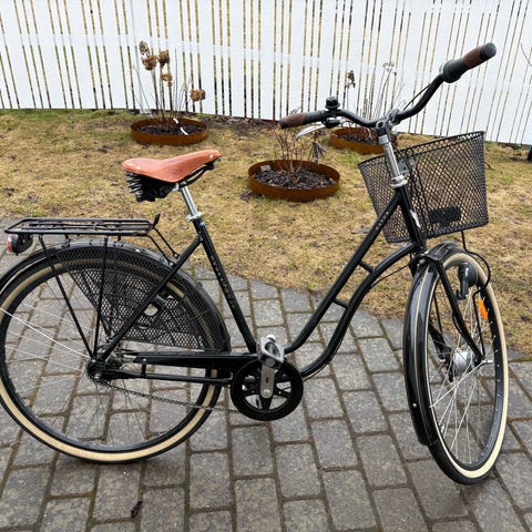 Crescent Sunna 7 växlar, damcykel i bordeaux färg. Cykeln har lågt insteg och är utrustad med korg framtill samt pakethållare bak. Hjulstorlek cirka 28 tum med ljusa däck. Sadeln och handtagen är i matchande brun färg. Passar för vardagscykling och transporter i stadsmiljö eller på landsväg för kvinna.