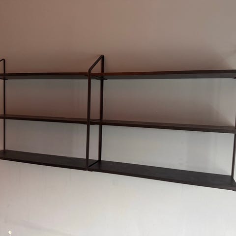 Svart vägghylla i trä och metall. Solitt hyllplan i trä och metallram med fästen för upphängning.