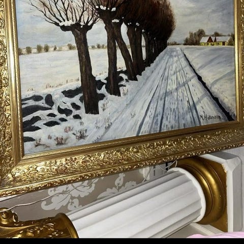 Tavla med motiv av ett vinterlandskap med snötäckt mark, träd och himmel. Målningen är inramad i en profilerad ram. På baksidan finns texten "Vinterdag" samt Krüger. Passar som väggdekoration i hem eller fritidshus med natur- eller landskapstema.