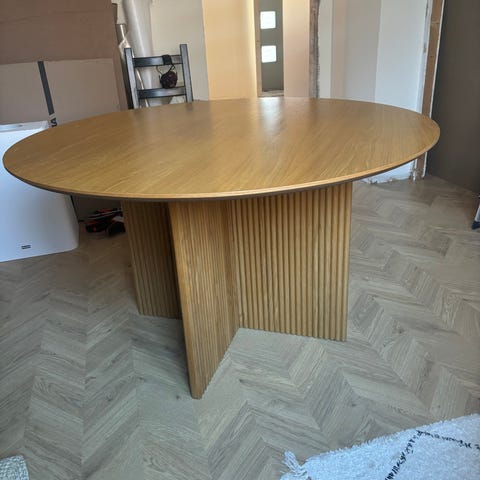 Använt men fullt fungerande. Gör kanske att slipa oxå då faneren verkar rätt så tjock då bordet är tungt. 80x130-175cm