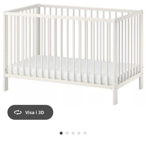 IKEA spjälsäng i vit färg. Klassisk spjälsäng med ribbor runtom och plan liggyta. Passar för spädbarn och småbarn. Madrass ingår enligt bild. Mått och exakta materialspecifikationer enligt IKEAs standard för denna typ av spjälsäng.