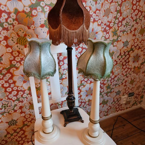 2 st bordslampor i keramik med skärm. Höjd fot ca 59 , bredd fot max 16 , lampskärm bredd 57.
