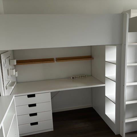 Loftsäng från Ikea säljes. Finns en del ritmärken på skrivbordet och några rester efter klistermärken, men annars i bra skick.