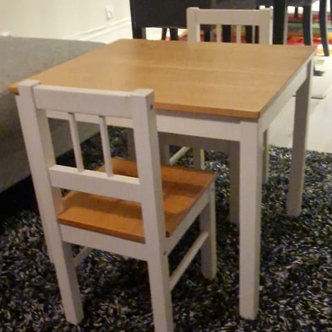 Barnbord i massivt trä med två tillhörande stolar, bordsskiva 65x65 cm och höjd 56 cm.