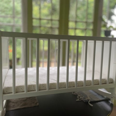Grå sammet vagga använd bara en månad i fint skick. Hård botten så skulle rekommendera att ha tjockare bäddmadrass. Underlakan ingår i priset, helt ny bara tvättad.