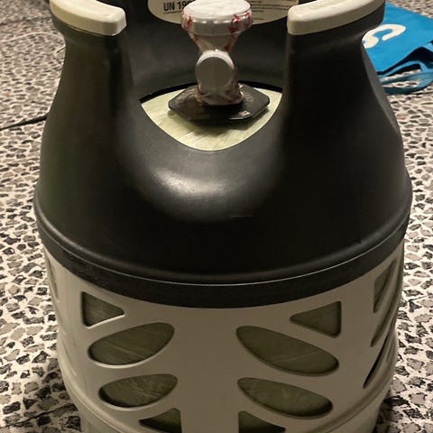 Den här väger 8,7kg så 2kg gasol kvar i den.