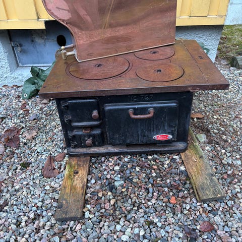 Vedeldad gjutjärnsspis på ben . Spisen har kokplattor upptill med lösa ringar o ugnslucka framtill. Underdelen har en praktisk hylla för förvaring av ved eller köksredskap. Passar för uppvärmning och matlagning i exempelvis torp, fritidshus eller som inredningsdetalj i äldre miljöer. Rökrörsanslutning finns upptill på spisen men går även att ha bakåt på baksidan.