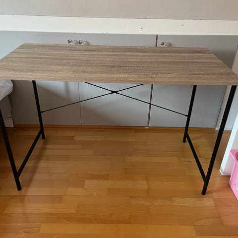 Stilrent och prima skrivbord i modern design från Jysk. Svart skiva och svart stabil stålram. Litet slitage på skivan men verkligen inget man tänker på. Vi gör av oss med det för att vi möblerat om i arbetsrummet och det inte längre passar som vi tänker oss.