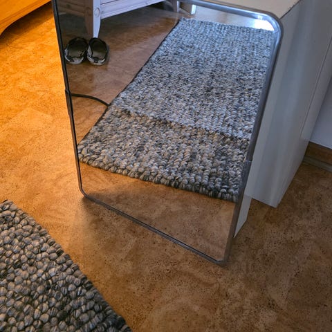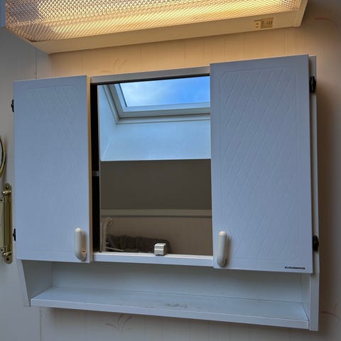 Badrumsskåp (retro) med spegel och integrerad belysning upptill. Skåpet är väggmonterat och har två spegeldörrar. Invändigt finns 6 flyttbara glashyllor. B 790, H 620 mm.