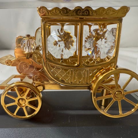 Skulpturen är placerad på en bas dekorerad med hieroglyfer och skyddas av en löstagbar glaskupa.