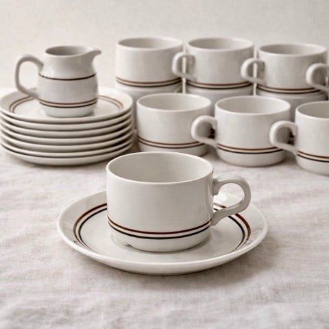 Tekanna, gräddkanna och sockerskål. Servisen är i vitt med röda vertikala ränder. Tekannan har handtag i naturfärgat material. Koppar och fat är matchande i samma rödvita dekor. Undersidan är stämplad Gustavsberg Flintgods Sweden. Passar för servering av te eller kaffe i hemmet eller vid dukning för flera personer.