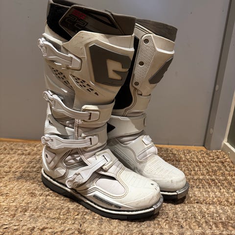 Fox Comp 5 crossstövlar i storlek EU 44. Stövlarna är i svart och vitt med justerbara spännen framtill. Modellen är avsedd för motocross eller endurokörning och har förstärkningar runt fot, häl och skenben. Invändigt finns vadderat foder för ökad komfort vid körning. Stövlarna är märkta enligt EN13634 för motorcykelstövlar.