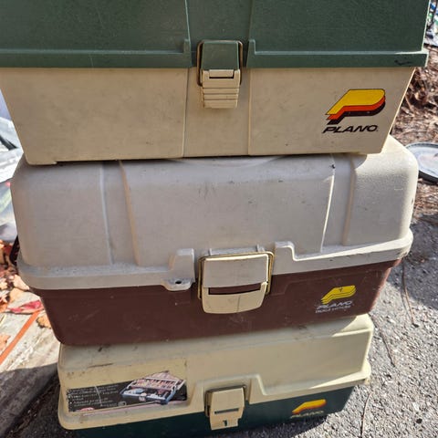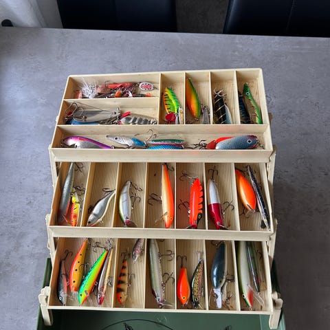 Komplett fiskeutrustning såsom spö, rullar, större förvaringslåda med tillbehör samt även småaskar, ryggsäck, vikbar pall, håv och huggkrok.
