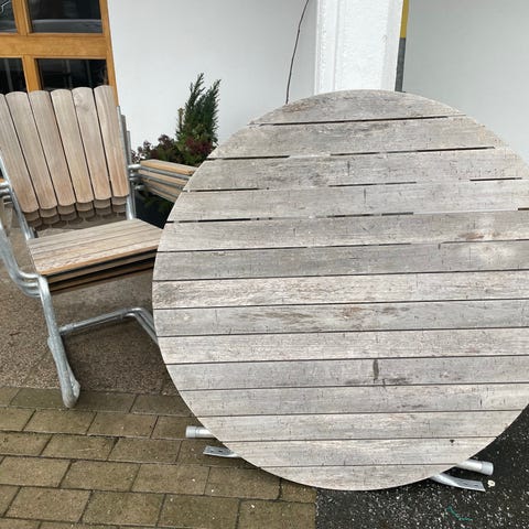 Matgrupp med rektangulärt utebord (180x100) och 6 stolar allt i teak. Inköpt mars 2025 för 8800kr på Tredrum. Säljes pga flytt. Stolarna är fällbara.