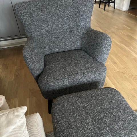 Grå fåtölj med fotpall säljes till högstbjudande.