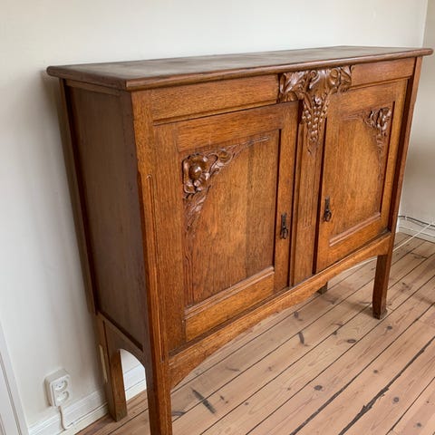 Fristående skåp i brun träfinish. Skåpet har två dörrar framtill med dekorativa beslag. Invändigt finns två sektioner med fasta hyllplan som ger god förvaring. Nertill finns utdragbara lådor för mindre saker. Skåpet står på ben som lyfter det från golvet och gör det lättare att städa under. Passar exempelvis i vardagsrum, matsal eller hall för förvaring av porslin, textilier eller andra hushållssaker.