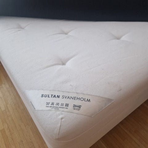 Bortskänkes säng IKEA Svaneholm. Fläckar finns, annars inget fel på sängen. Sover skönt i den.
