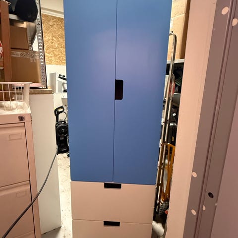 Har haft det som barngarderob, men har stora möjligheter att vara skåp eller annan typ av förvaring. Två stora lådor nedtill och övre med hylla (går att addera fler eller en garderobstång)