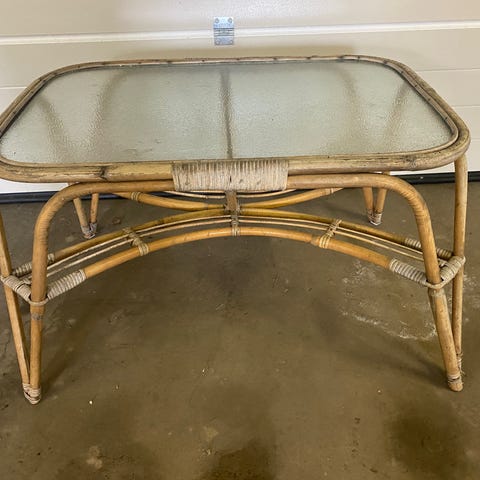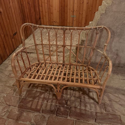 Fin soffa och bord i rotting som är trevliga att ha i uterummet eller trädgården sommartid. Köpta 2022 och i fint skick, färgnyansen är något förändrad på soffan sedan den köptes eftersom den förvarats i uterum, och en "snörning" på bordet har släppt.