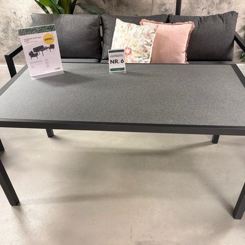Trädgårdsgrupp bestående av en soffa, ett bord och en fåtölj.