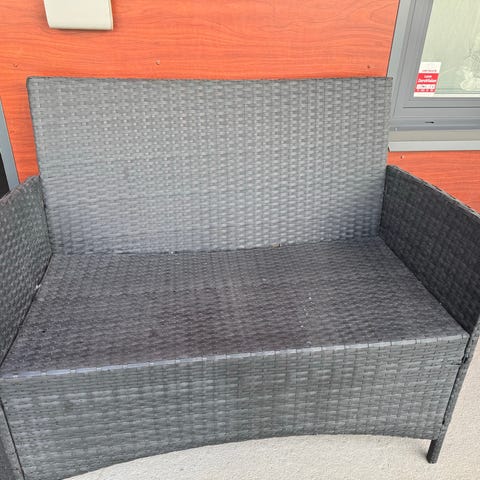 Soffan har grå stomme i metall med sits och rygg i mörkgrå textilene eller liknande vävd plast. Den har två sittplatser och armstöd på båda sidor. Baksidan är förstärkt med metallram.