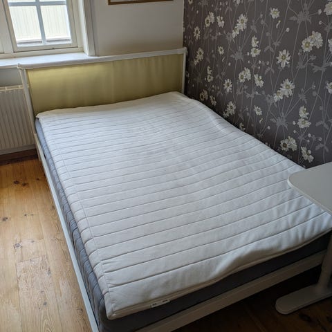 Stabil sängram i bra skick. Undre madrass i bra skick! Bäddmadrass har några fläckar men ingår om man vill. Kan säkert tvättas bort.