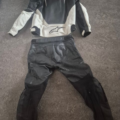 Dainese stl 48, svart/grått/vitt Två delat. Mycket fint. Inga skrap märken på knän eller ställ.