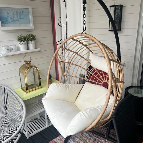 Hängstol i rottingliknande material med fristående metallställning. Stolen har generös sittyta med tjocka grå dynor för rygg och sittdel. Passar för inomhusbruk, exempelvis i vardagsrum eller uterum. Rundad äggformad design med öppna ribbor i ryggen. Levereras med upphängning i ställning enligt bild. (Tass dynan med fusk päls ingår ej)