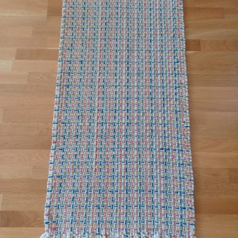 Hemvävd matta dubbelvävd i ljusa färger finns I Linköping rök och djurfritt hem