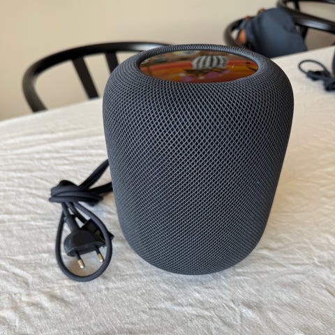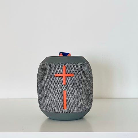 Cylindisk kompakt design med tygklädd högtalarkropp och tydliga volymknappar på framsidan. Utrustad med upphängningsögla upptill för enkel transport eller upphängning.