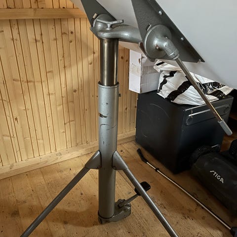 Ritbord eller liknande med lutningsbar bordsskiva och tillhörande arbetsstol i trä. Bordet har en stor vit rit-/arbetsyta med trälister som stöd för papper eller material. Underredet är i metall med ett sidoställt förvaringsfack i trä med låda och öppna hyllor för förvaring av ritmaterial eller dokument. Arbetsstolen har sits och ryggstöd i trä med metallstativ och kryssfot. Passar som arbetsplats för ritning, skissarbete eller annat precisionsarbete i hemmet, hobbyrum eller mindre ateljé.