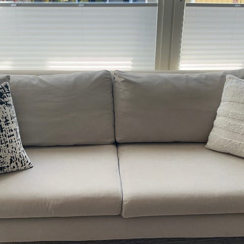 Vi har använt den varsamt men den fick en liten matfläck nyligen som vi inte hann få bort innan ny soffa kom, därav det låga priset. Den lilla fläcken syns på en av bilderna.