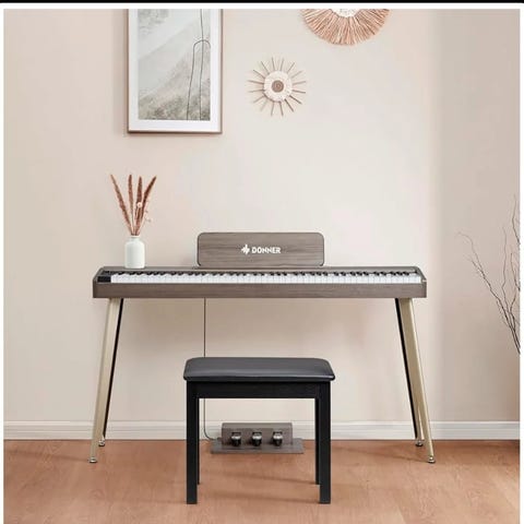 Gear4music DP-10X digitalpiano i svart utförande. Pianot har inbyggda högtalare, tre pedaler och kontrollpanel med volymreglage, metronom, inspelnings- och uppspelningsfunktion samt olika ljud- och funktionsval. Passar för övning och spel i hemmet, med möjlighet att använda hörlurar för tyst spelning.