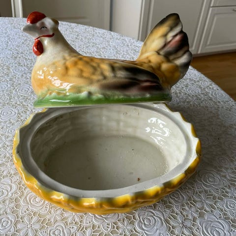 Två små skålar formade som höns i svart respektive vitt med flerfärgade detaljer. Varje skål har en liten träslev. Passar exempelvis för servering av salt, kryddor eller små tillbehör i kök eller på matbord. Undersidan är stämplad med designangivelse. Design Madeleine Hillgrund. Cant of Sweden.