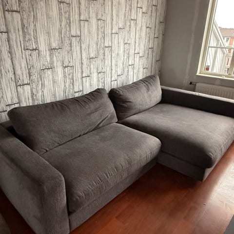 Stor och bekväm mörkgrå soffa med schäslong säljes på grund av flytt. Perfekt för vardagsrum eller TV-hörna. Soffan är rymlig och skön att sitta och ligga i.
