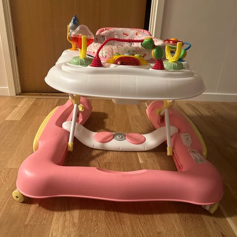 Babymoov gåstol i rosa med vit detaljering. Gåstolen har stoppad sits med mönstrad textil och hög rygg för stöd. Utrustad med lekpanel framtill med flera olika leksaker och aktivitetsdelar. Modellen har hjul undertill och en ram i plast och metall. Passar små barn som håller på att lära sig stå och gå, och kan användas inomhus på plana golvytor enligt tillverkarens anvisningar.