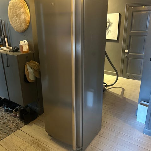 Electrolux kylskåp i rostfritt stål, modell LRC5MF34X (2021). 344 liter. H 180 cm, B ca 60cm, D ca 65cm. Lite använt. Skåpet har flera justerbara glashyllor, justerbara dörrhyllor i plast, grönsakslåda längst ned samt flaskhylla i metall. Invändig belysning och vertikal handtag på dörren. Passar som fristående kyl i kök, grovkök eller förråd där man behöver ett högskåp med god översikt och förvaring av mat och dryck.