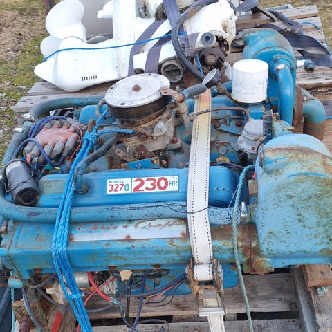 Båtmotor säljes komplett med kablage och backslag. Motorn är för närvarande monterad på lastpall för enkel transport.