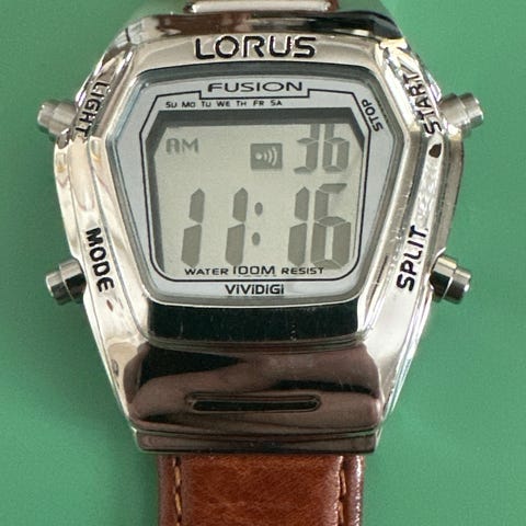 TALK TECH Klocka, retro, vintage, (NOS), 39,5 x 49 mm, stål, talande klocka som talar om tid mm när knappar används. Tyvärr går det till år 2012 då klockan är gammal men de andra funktioner fungerar, brunt läderarmband.