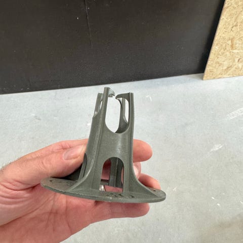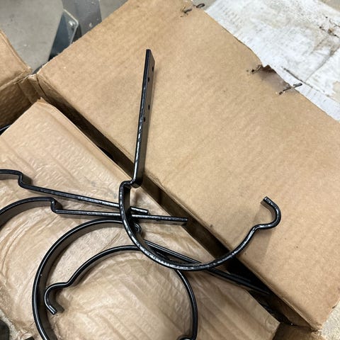 Rännkrok i metall i grå färg. Avsedd för montering av hängränna på takfot eller liknande konstruktion.