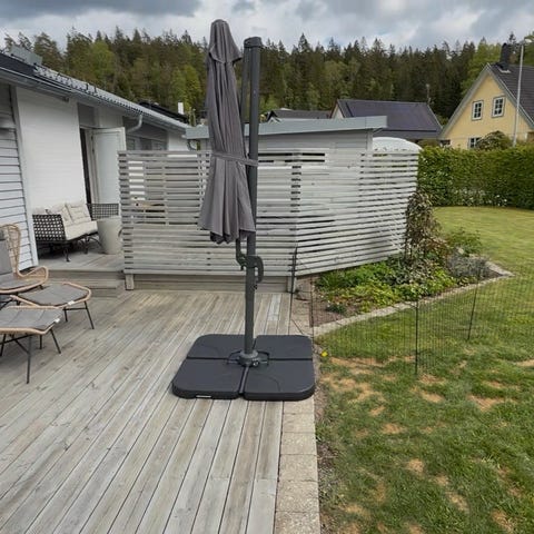Svart markis. Bredd 6 m, utfall 4 m med stödben till utfallet. Elektrisk motor med fjärrkontroll och det finns även en förlängd kappa med kardborrfäste. Markisen är 13 år gammal men i mkt fint skick.