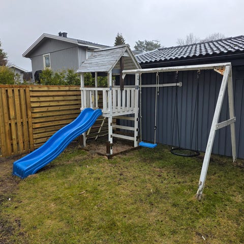 Lekställning inklusive tvillinggunga, repstege och klätterrep enligt bild. Använt skick, men fullt fungerande. Bortskänkes.