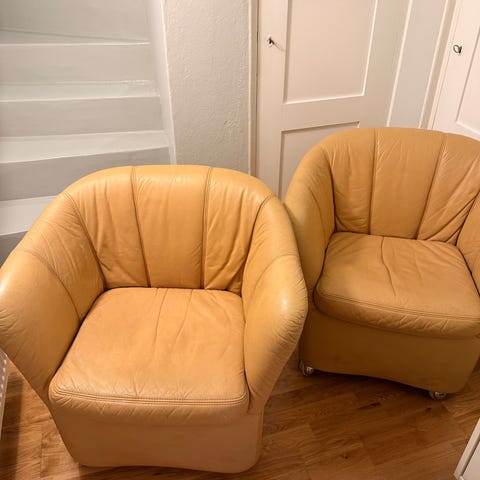 Säljer två fina karmfåtöljer i skinn, bägge i väldigt skick. Finns givetvis spår av att man suttit i dom överlag i mycket fint skick.