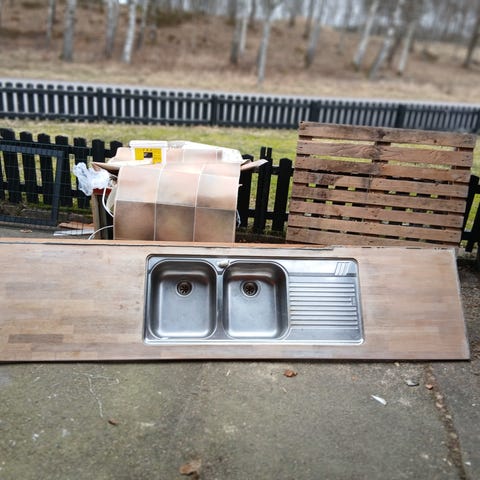 Rostfri diskbänk med två hoar. Bänkskivan är i metall (rostfritt stål) med integrerade hoar placerade i ena änden. Den ena hon har avrinningssil. Passar för kök, grovkök eller liknande utrymmen där en tålig och lättstädad arbets- och diskyta behövs.