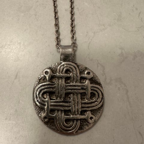 Bronshalsband föreställande meditationslabyrinten Trojaborg. Hänge storlek 47 x 37 mm. Kedja, längd 60 cm. Sluten kedja utan lås.
