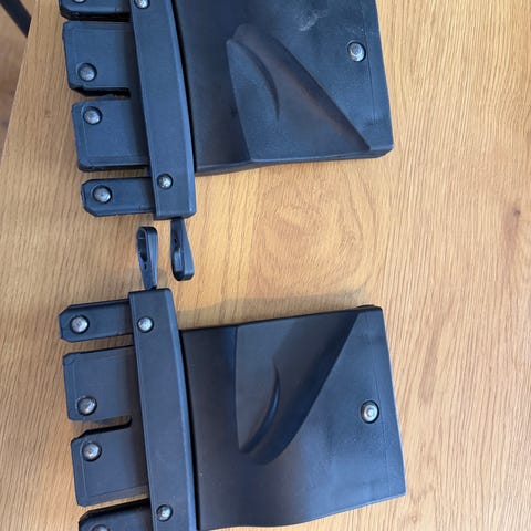 Emmaljunga Maxi Cosi adapter för barnvagn. Adapterparet används för att fästa babyskydd av typen Maxi Cosi på kompatibla Emmaljunga‑chassin. Modellen är märkt "Maxi Cosi Adaptor Standard" på undersidan. Tillbehöret består av två separata fästen i svart plast med tydlig "Press"‑knapp för låsning och lossning. Avsett som tillbehör till barnvagnssystem där babyskydd kan klickas direkt på vagnens chassi.