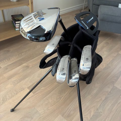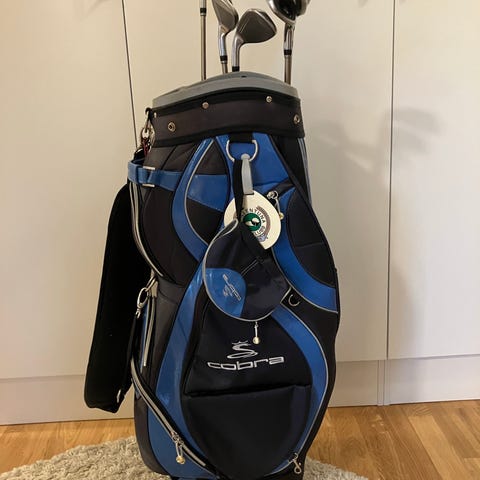 Cobra King JR 13-15 år komplett golfset med tillhörande bärbag i mycket fint skick då det är bara är sporadiskt spelat på i två säsonger. Setet innehåller följande järnklubbor; 6, 7, 8, 9, P och S, samt metalwoods 5, 3 och Driver från samma serie. Regnhuva, headcovers till metalwoods samt matchande handduk (kan behöva tvätt) medföljer.